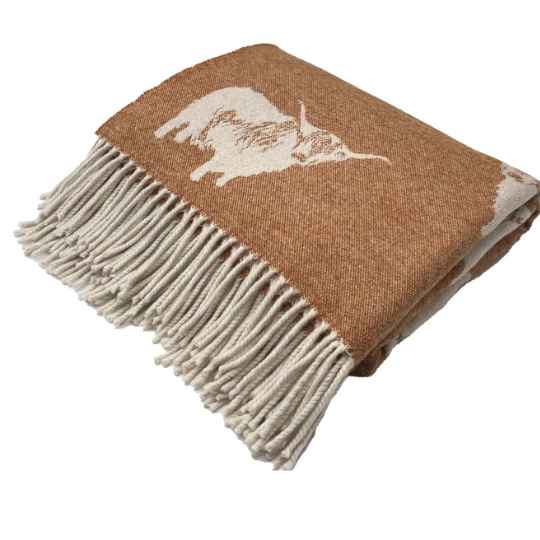 This gorgeous Highland cow wool throw is made in Scotland by Remony and woven from 100% merino lambswool,